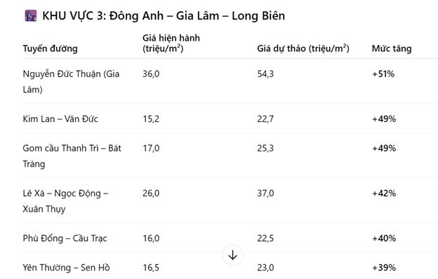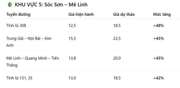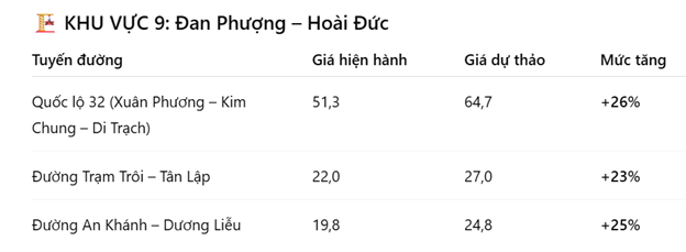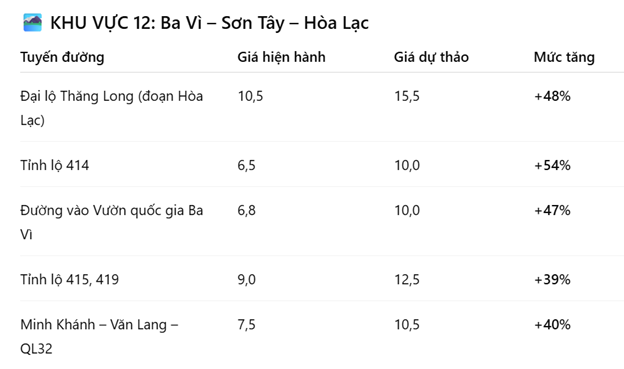 Trong đó, các tuyến đường thuộc khu vực Ba Vì, Sóc Sơn, Gia Lâm, Phú Xuyên ghi nhận mức tăng cao nhất. Cụ thể, tỉnh lộ 414 (Ba Vì) dự kiến tăng từ 6,5 lên 10 triệu đồng/m², tương đương +54%; tỉnh lộ 308 (Sóc Sơn) từ 12,5 lên 18,5 triệu đồng/m² (+48%); đường Kim Lan – Văn Đức (Gia Lâm) từ 15,2 lên 22,7 triệu đồng/m² (+49%); đại lộ Thăng Long đoạn Hòa Lạc từ 10,5 lên 15,5 triệu đồng/m² (+48%).