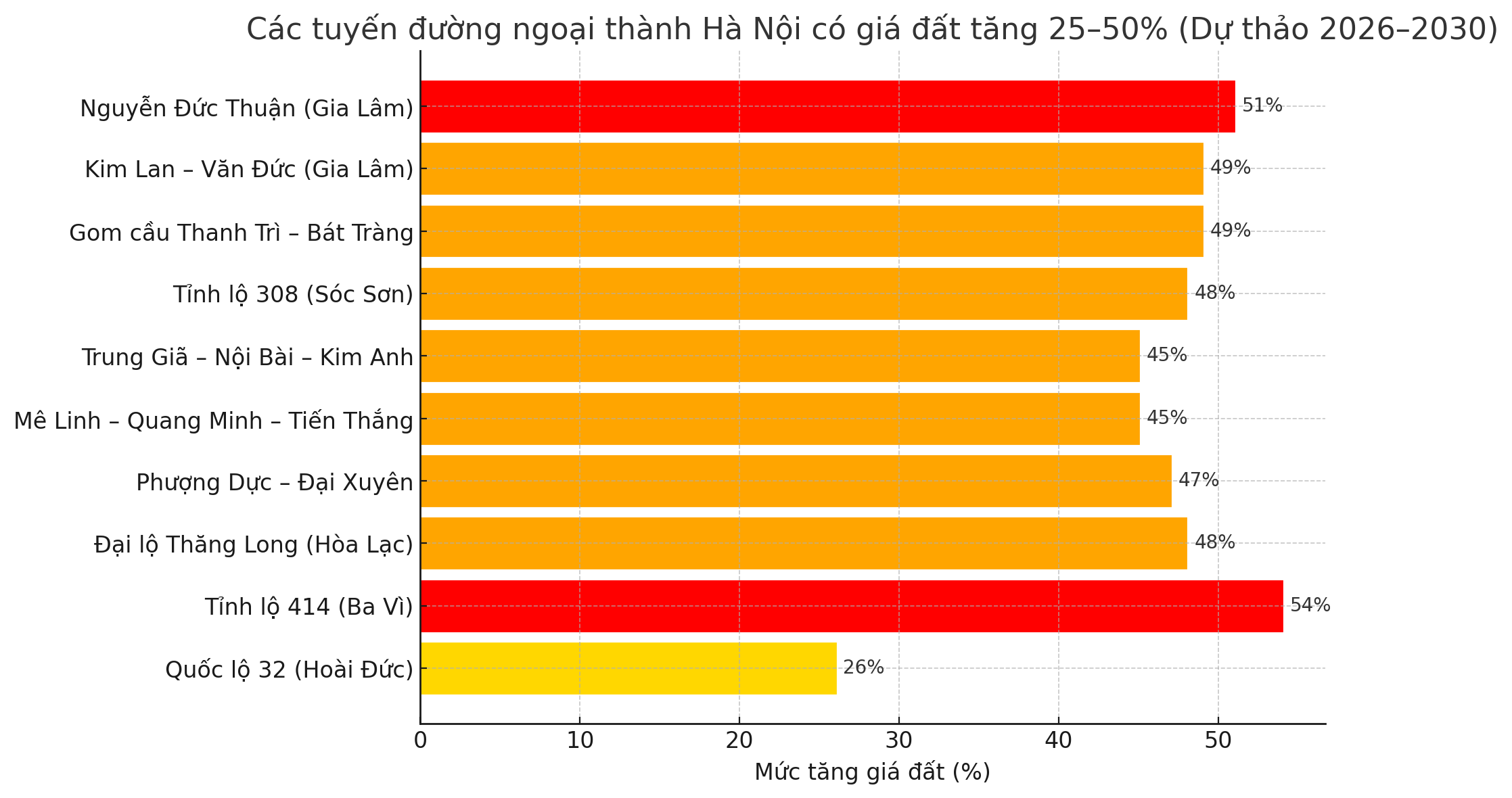 Dưới đây là chi tiết các tuyến đường ngoại thành Hà Nội có bảng giá đất tăng mạnh từ đầu năm 2026.