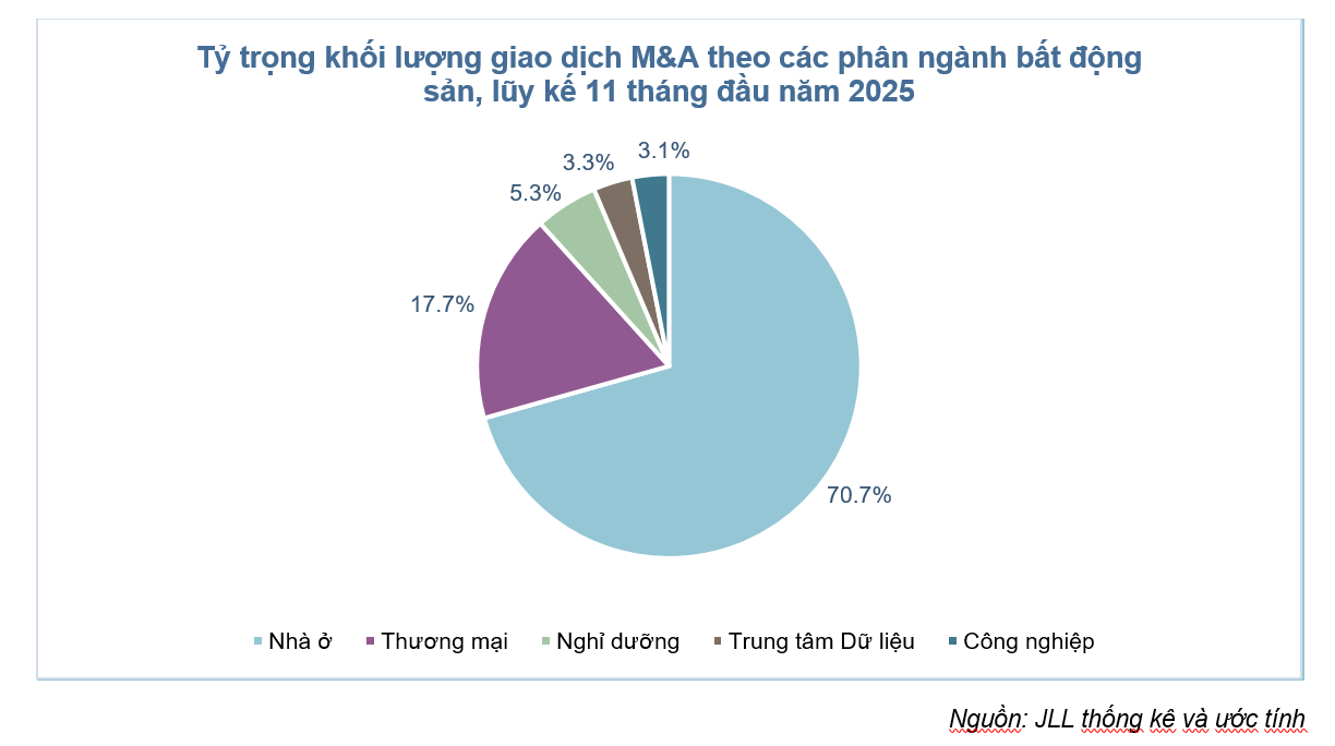 Các phân khúc khác như bất động sản thương mại và nghỉ dưỡng lần lượt chiếm tỷ trọng khoảng 17,7% và 5,3%. Lĩnh vực Trung tâm dữ liệu cũng đang nổi lên như một trong những thị trường ngách tiềm năng, chiếm tỷ trọng giao dịch M&A ở mức 3,3%.