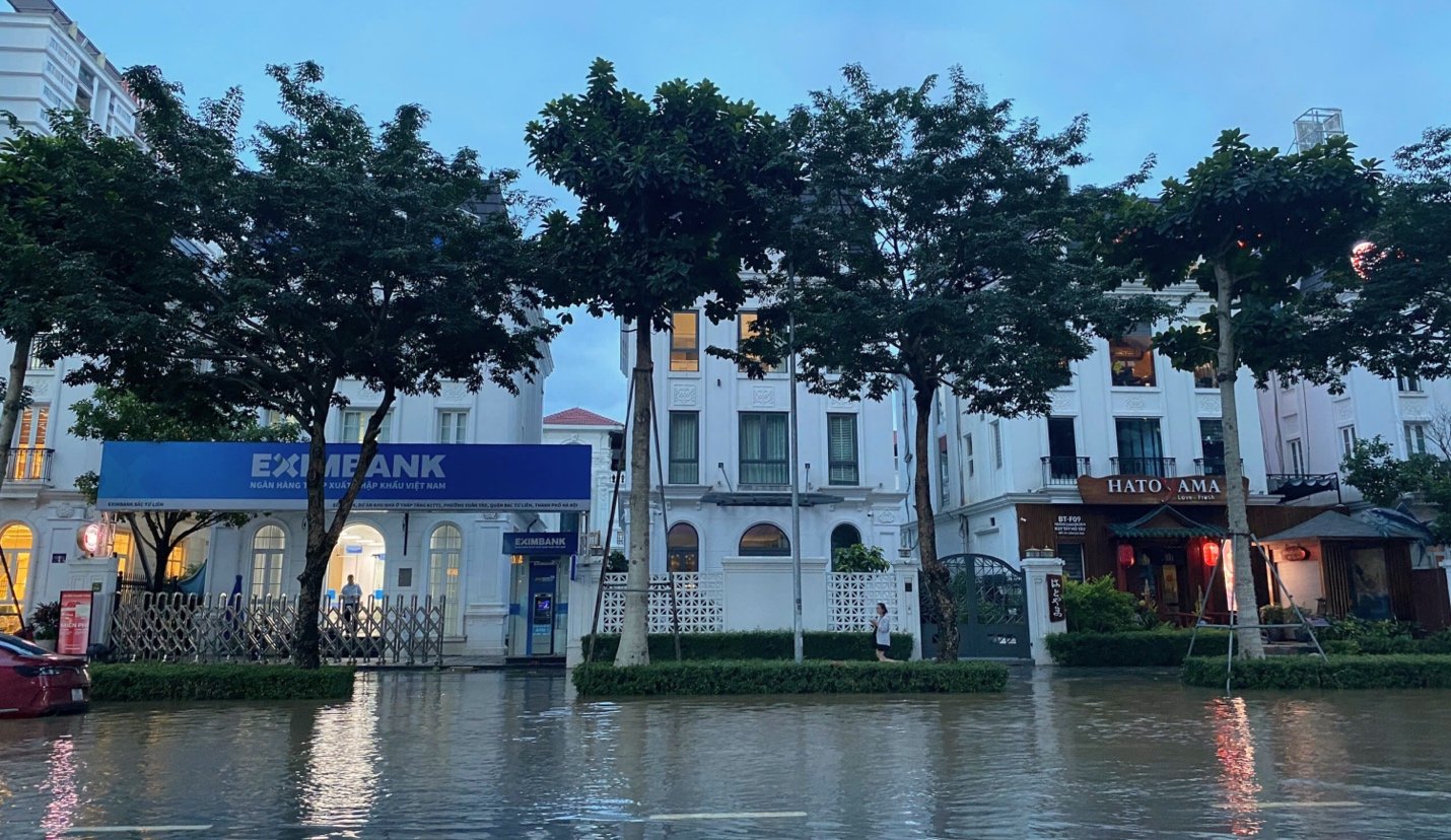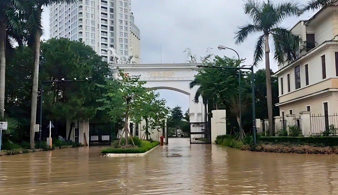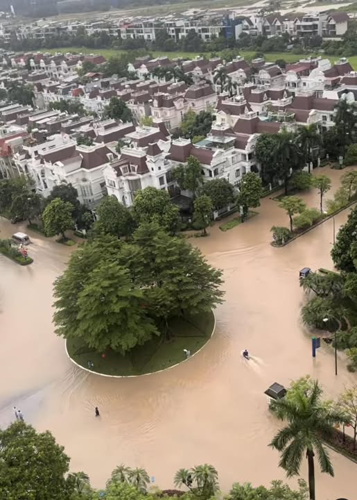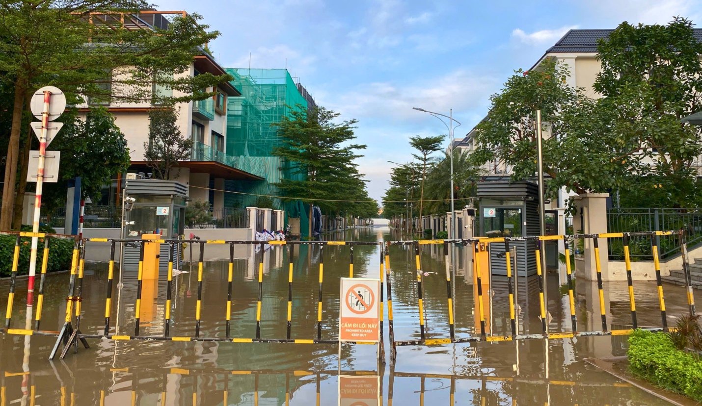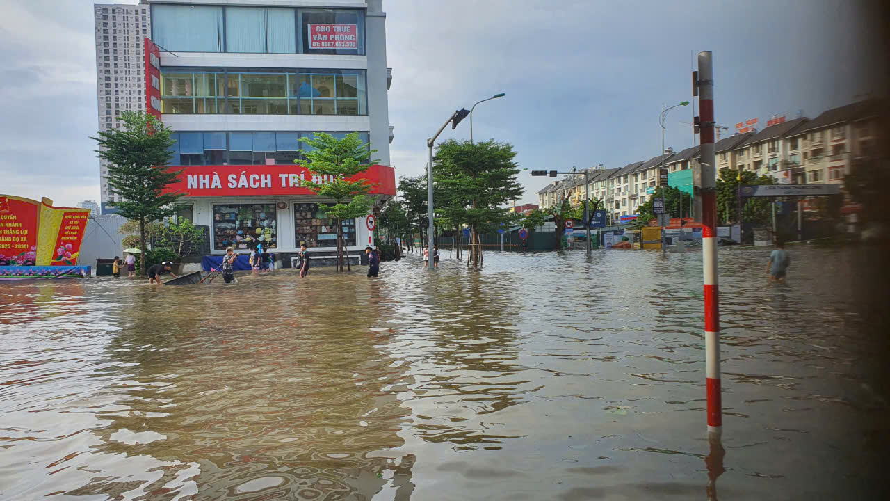 Một ngày sau trận mưa lớn kéo dài từ đêm 29-30/9/2025, tuyến đường Hoàng Tùng (xã An Khánh, Hà Nội) - nơi có một số khu đô thị xây dựng nhiều năm nay biến thành sông.