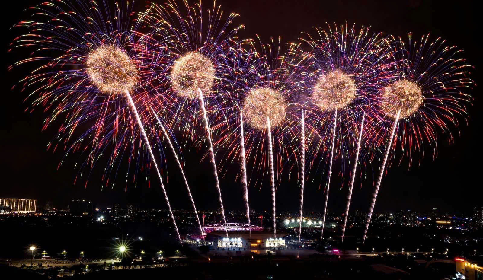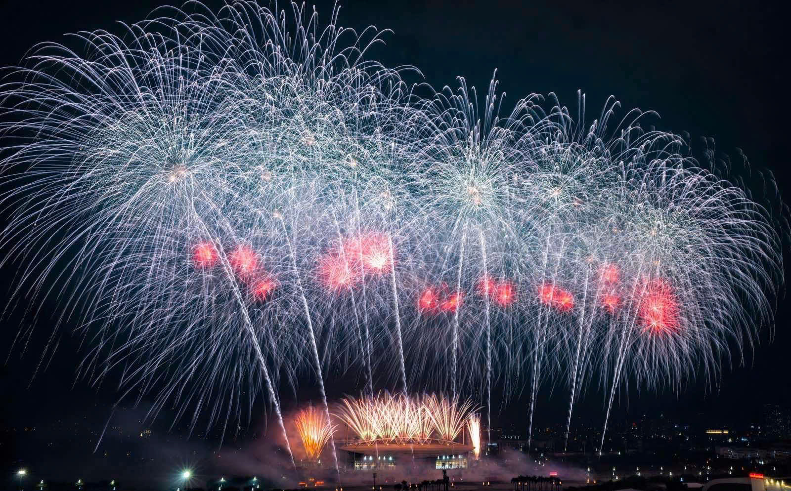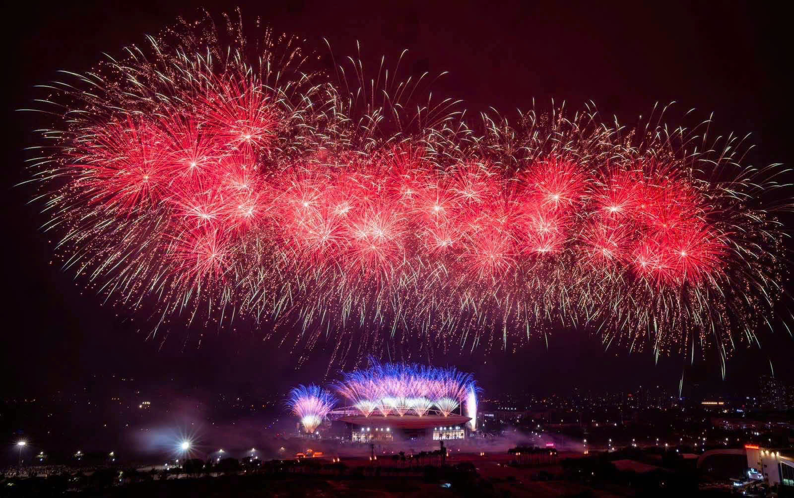 Màn pháo hoa rực rỡ nhiều màu sắc thắp sáng khu vực Sân vận động Quốc gia Mỹ Đình.