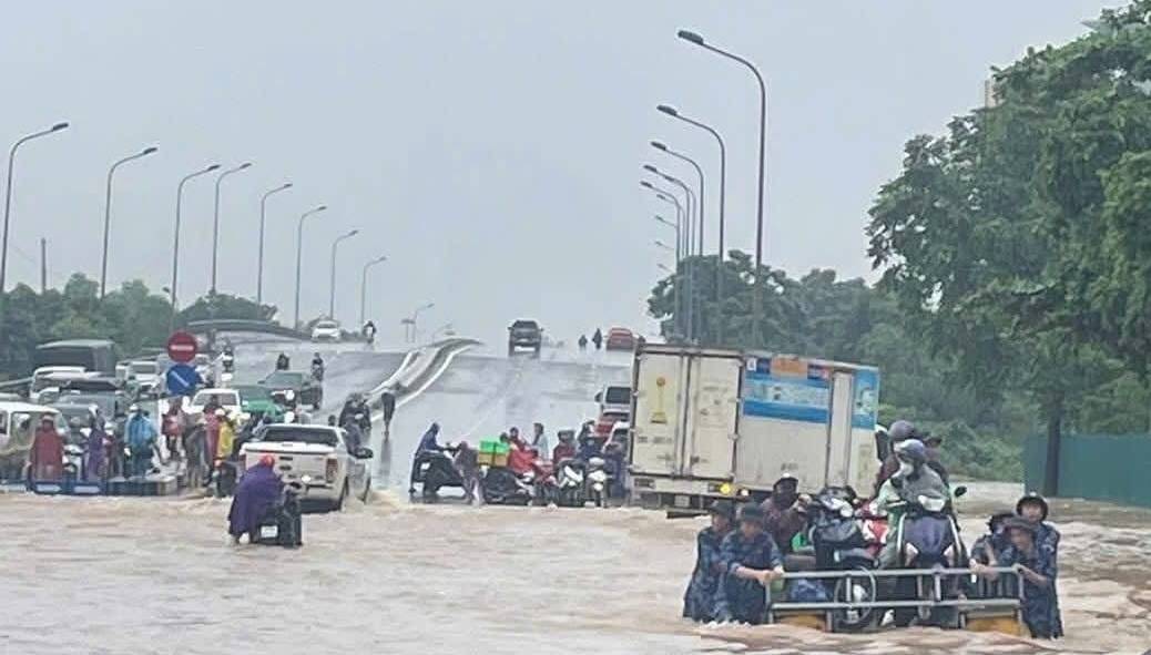 Mưa lớn đã gây ra 65 điểm ngập úng trên địa bàn. Tại Đại lộ Thăng Long, các hầm chui số 5, 6 ngập sâu, buộc lực lượng CSGT phải phong tỏa, căng dây, hướng dẫn phương tiện đi vòng.