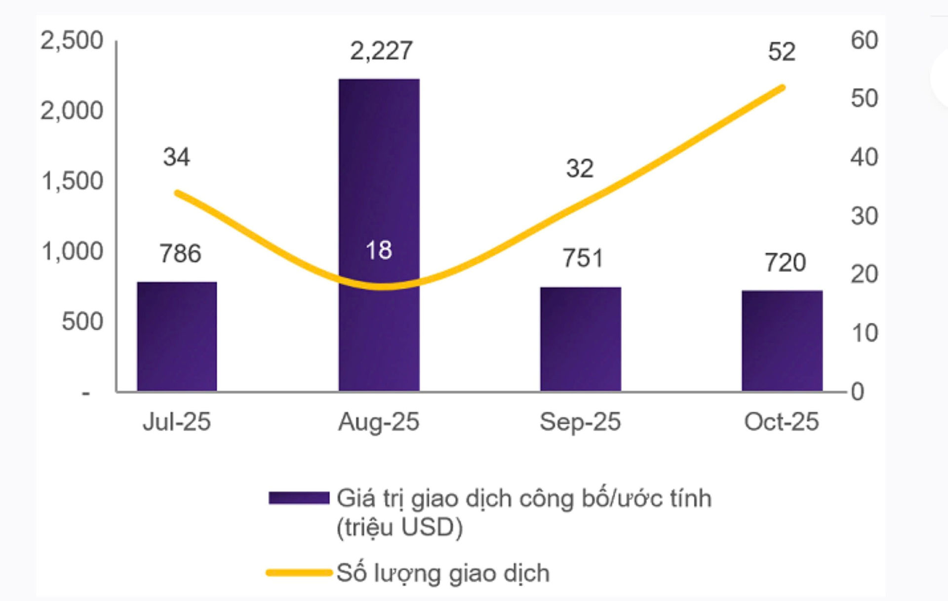 Tuy nhiên, bất động sản vẫn giữ vai trò trung tâm trong các thương vụ, đặc biệt là ở phân khúc bất động sản công nghiệp và nhà ở cao cấp. Trong tháng 10/2025, bất động sản giữ vững vị trí dẫn đầu thị trường M&A với giá trị khoảng 225 triệu USD. Tính chung 10 tháng năm 2025, thị trường ghi nhận hơn 2 tỷ USD đến từ các thương vụ M&A và huy động vốn cổ phần (bao gồm cả thương vụ đã hoàn tất và đang công bố) liên quan đến bất động sản, cho thấy sức nóng của lĩnh vực này.