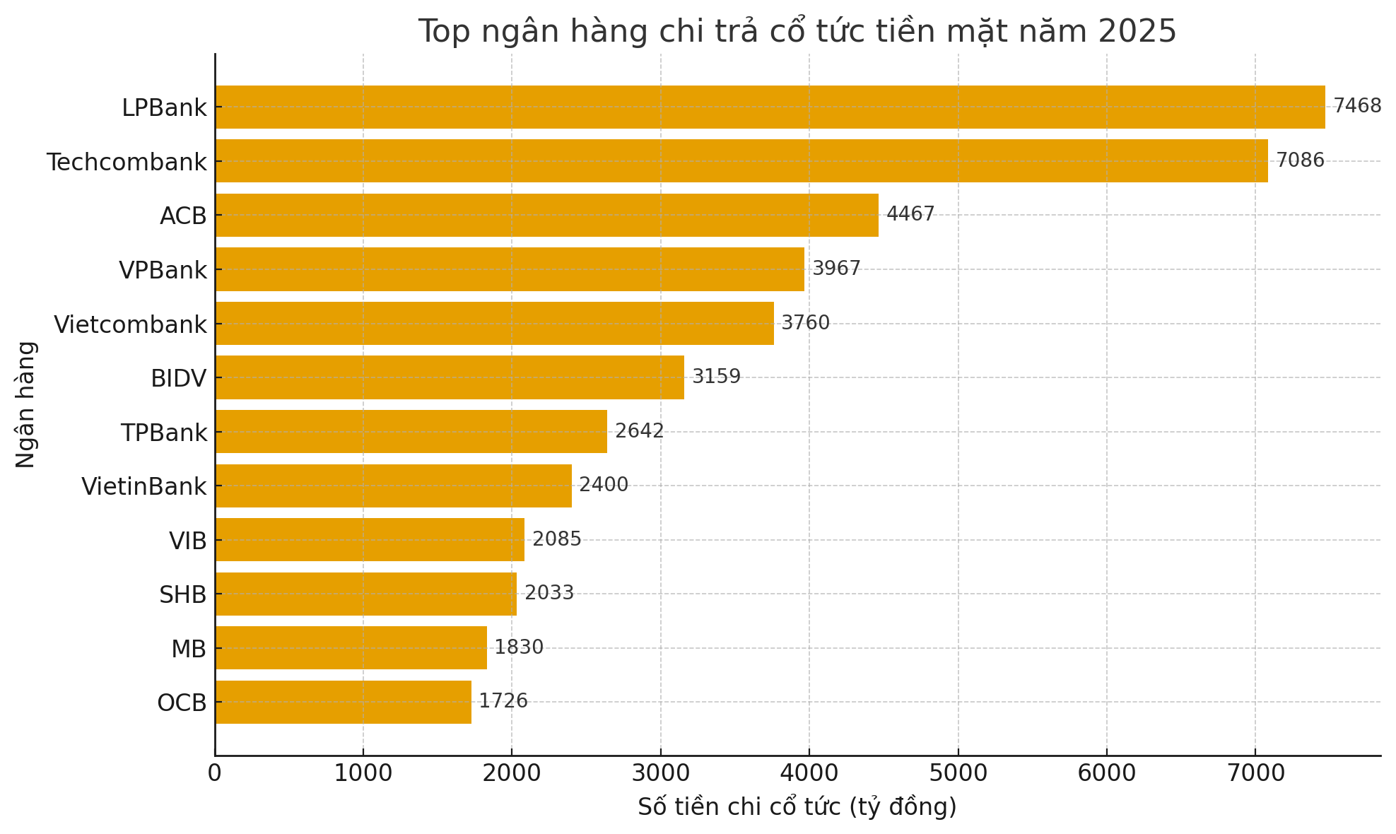 Đứng ngay sau là Techcombank, dự chi khoảng 7.086 tỷ đồng để trả cổ tức tiền mặt tỷ lệ 10%, ngày thanh toán dự kiến 22/10/2025. Đây cũng là lần chia tiền mặt lớn hiếm hoi của Techcombank trong những năm gần đây.