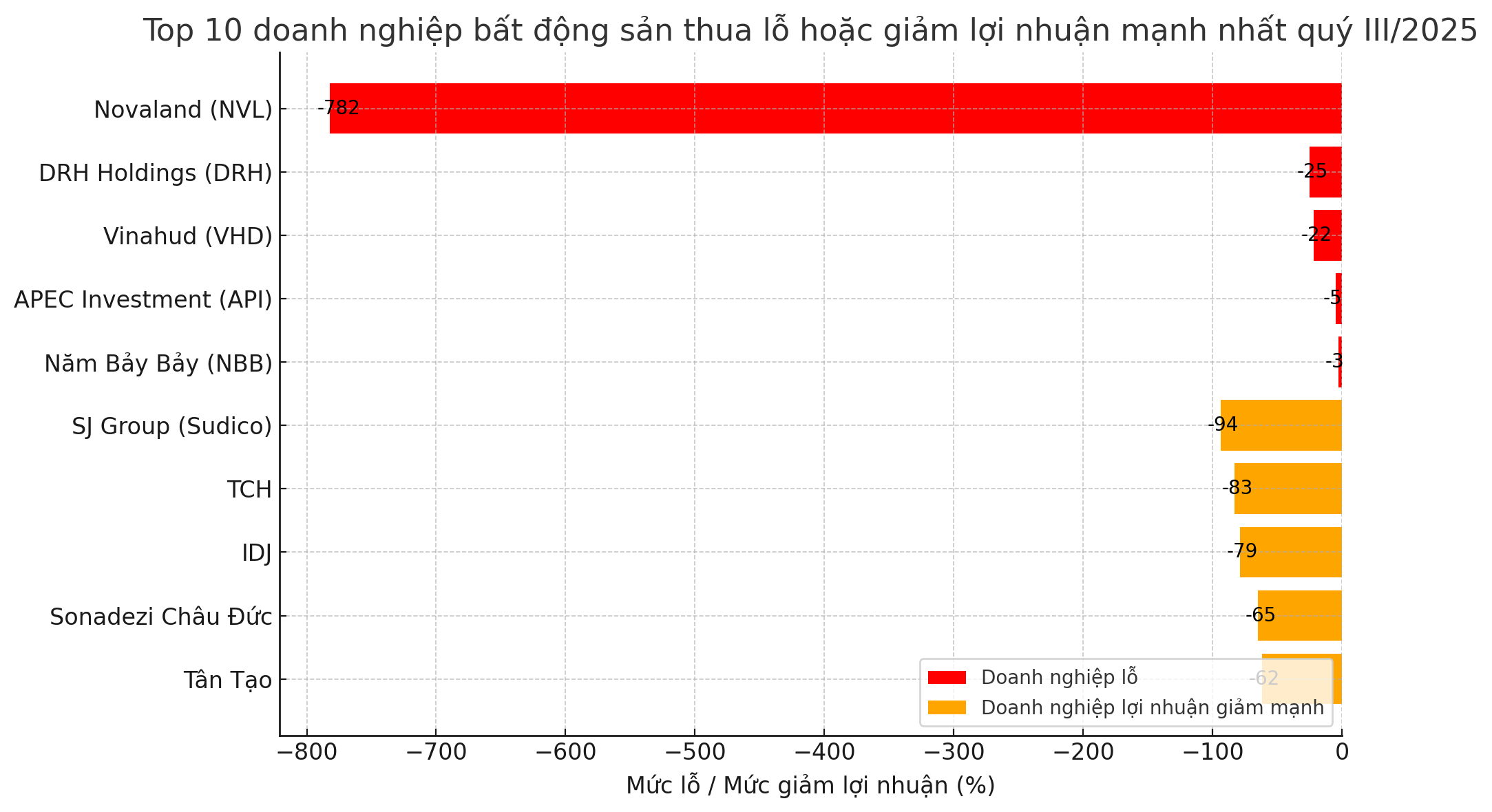 Dẫn đầu danh sách thua lỗ là Tập đoàn Novaland (NVL) khi báo lỗ trước thuế 782 tỷ đồng, đảo chiều mạnh so với khoản lãi 3.578 tỷ đồng cùng kỳ năm trước. Tính chung 9 tháng, doanh nghiệp này lỗ tới hơn 1.043 tỷ đồng, cho thấy những khó khăn trong tái cơ cấu tài chính và bàn giao dự án vẫn chưa được giải quyết triệt để.